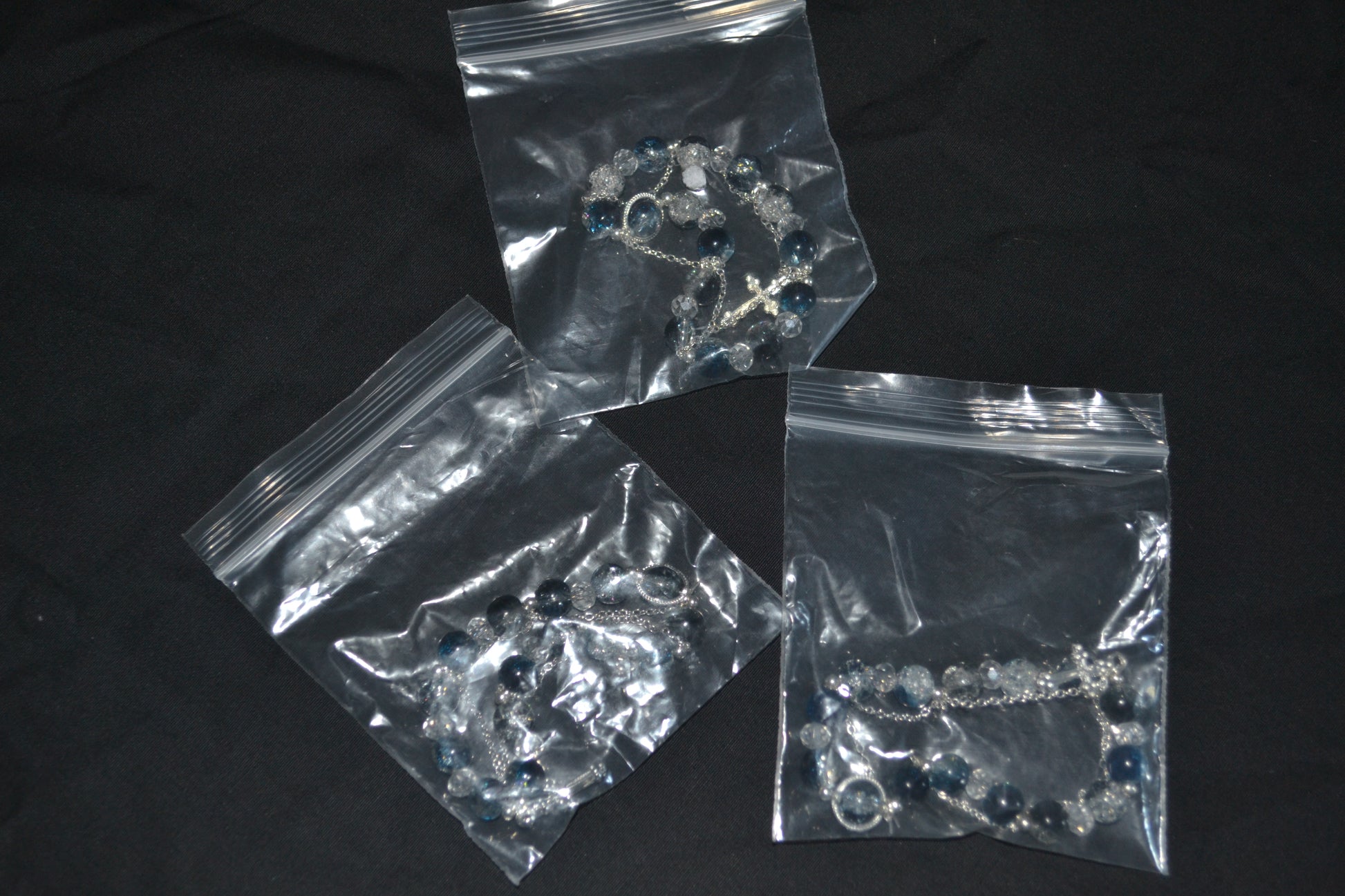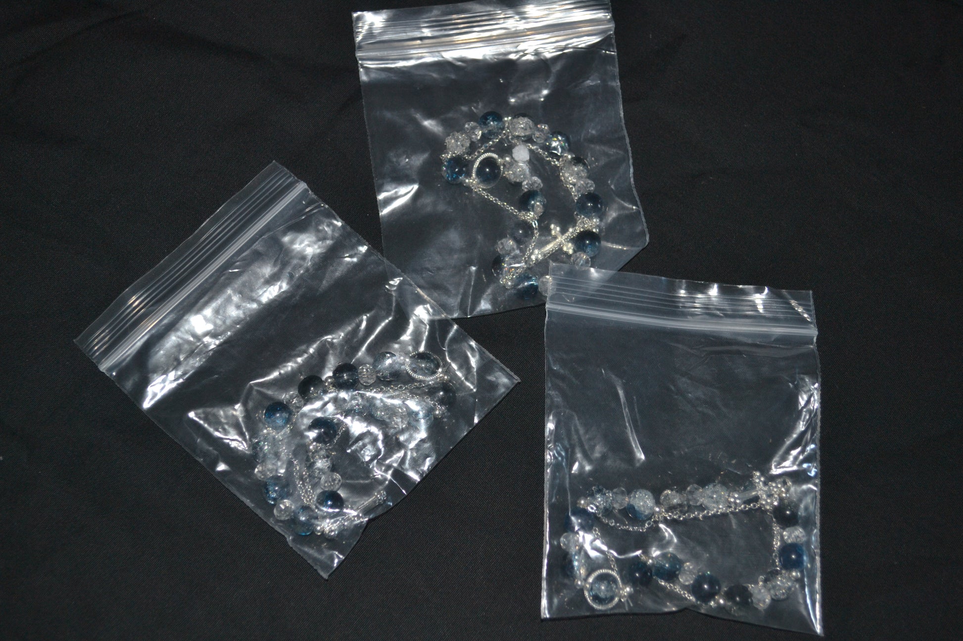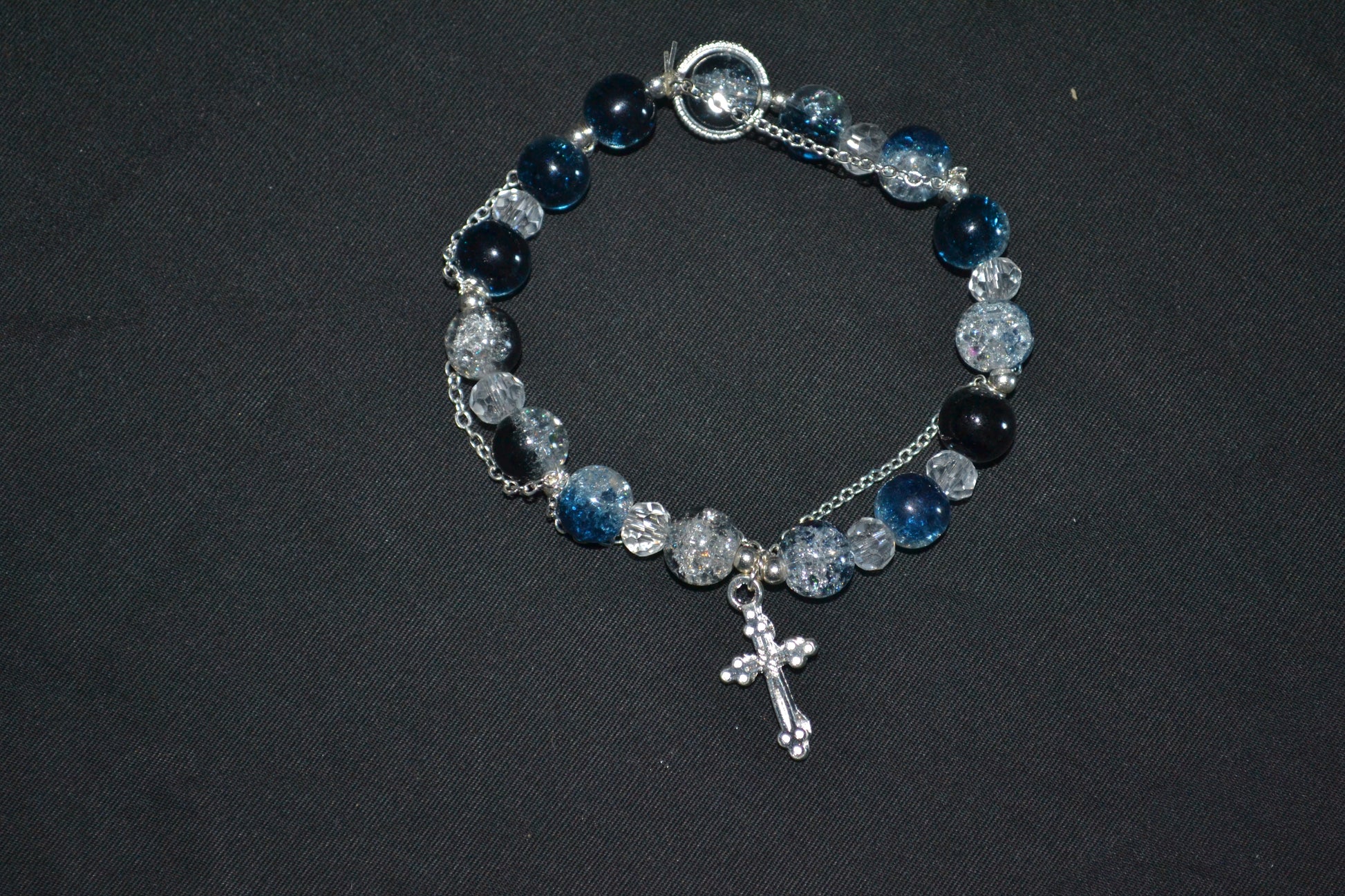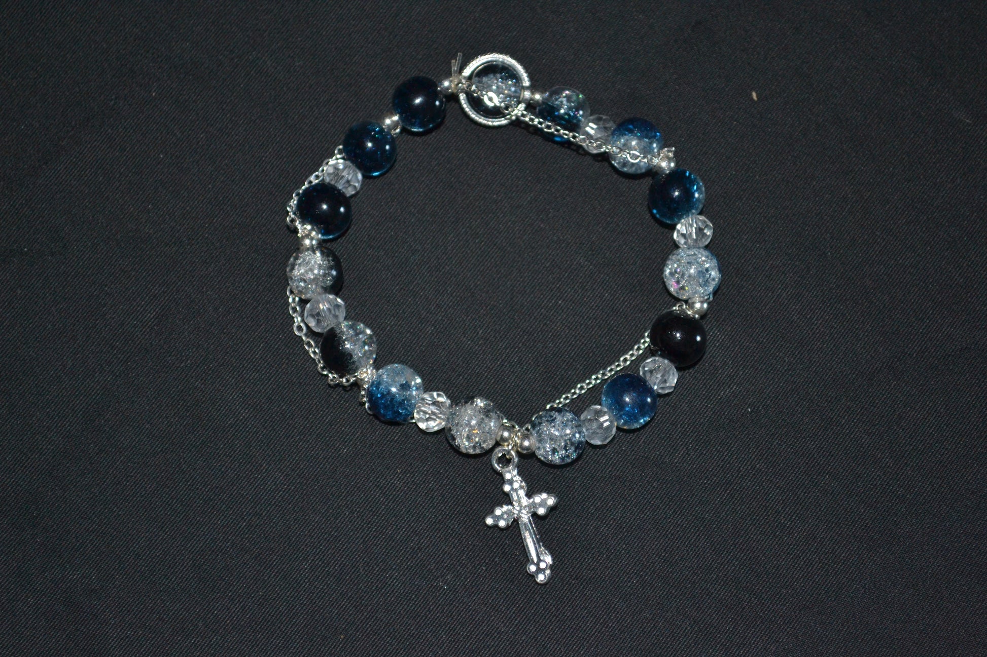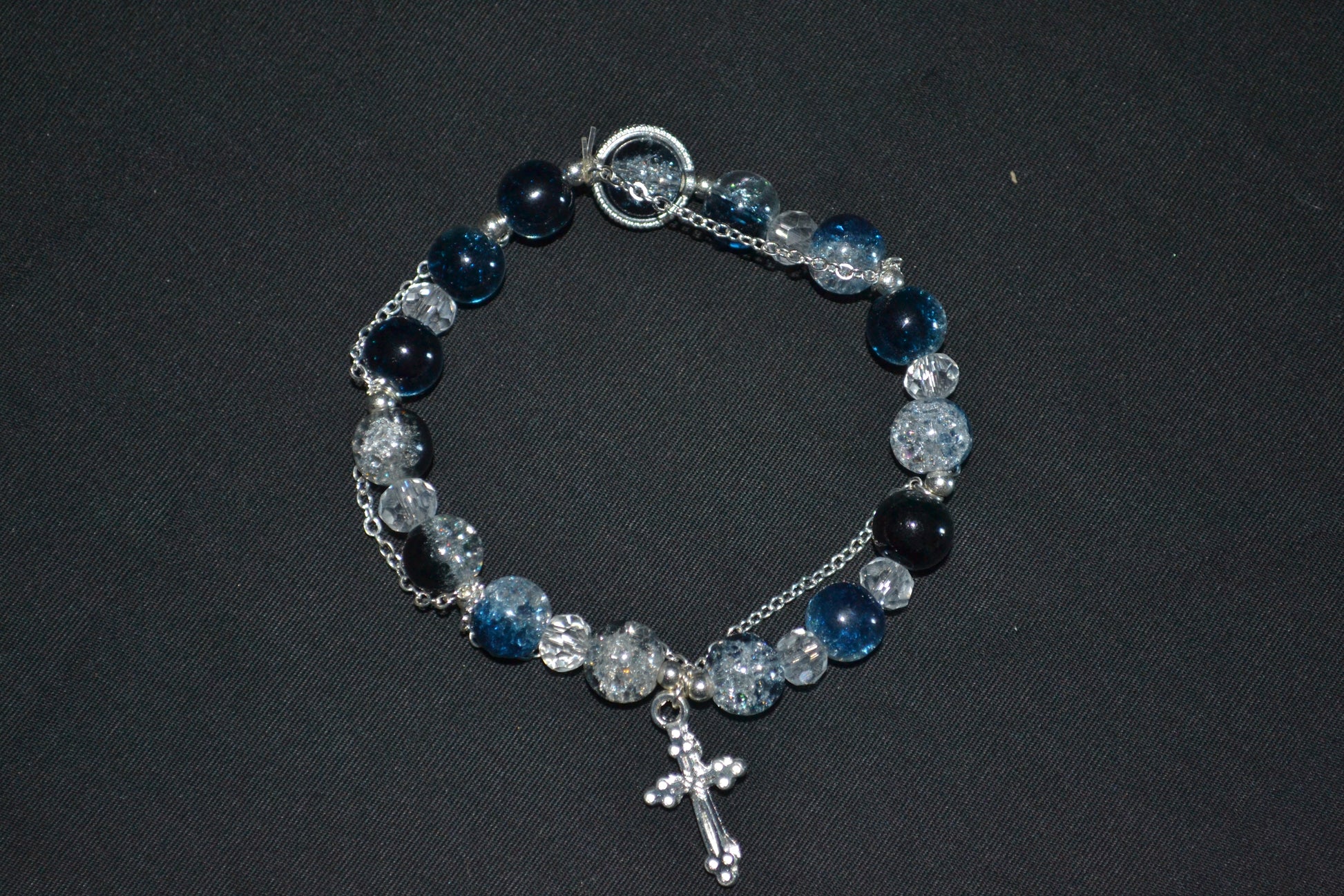 Make a bold statement with this bracelet featuring dark blue and clear crackle beads. Finished with a silver-tone chain and a dangling cross charm for a touch of elegance and edge.