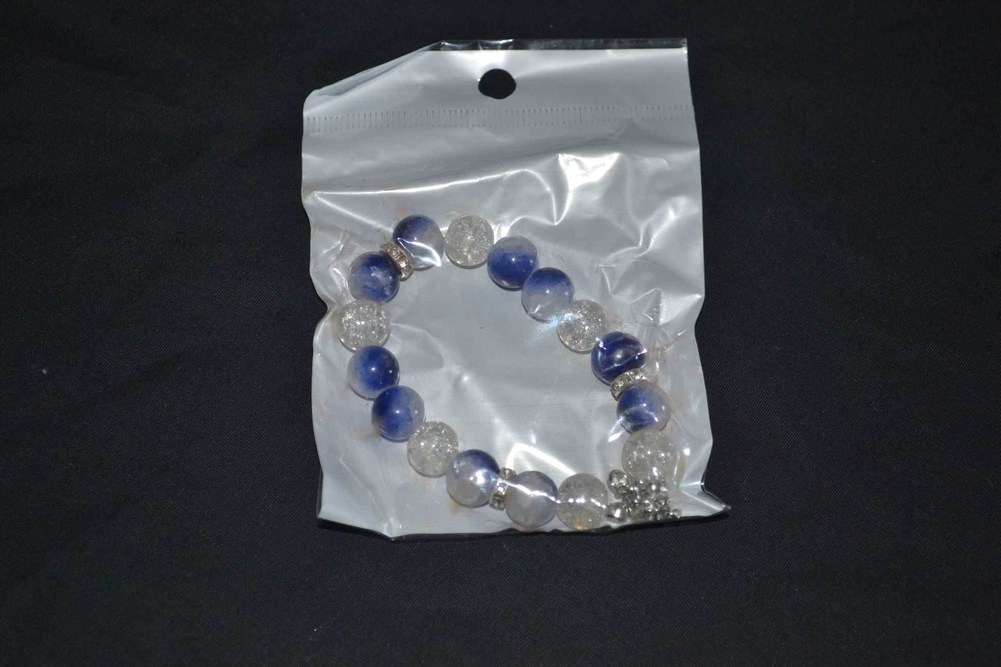 A cosmic combo of white cackle beads and dreamy blue ombre stones. This stretchy bracelets brings celestial vibes to your everyday look.
