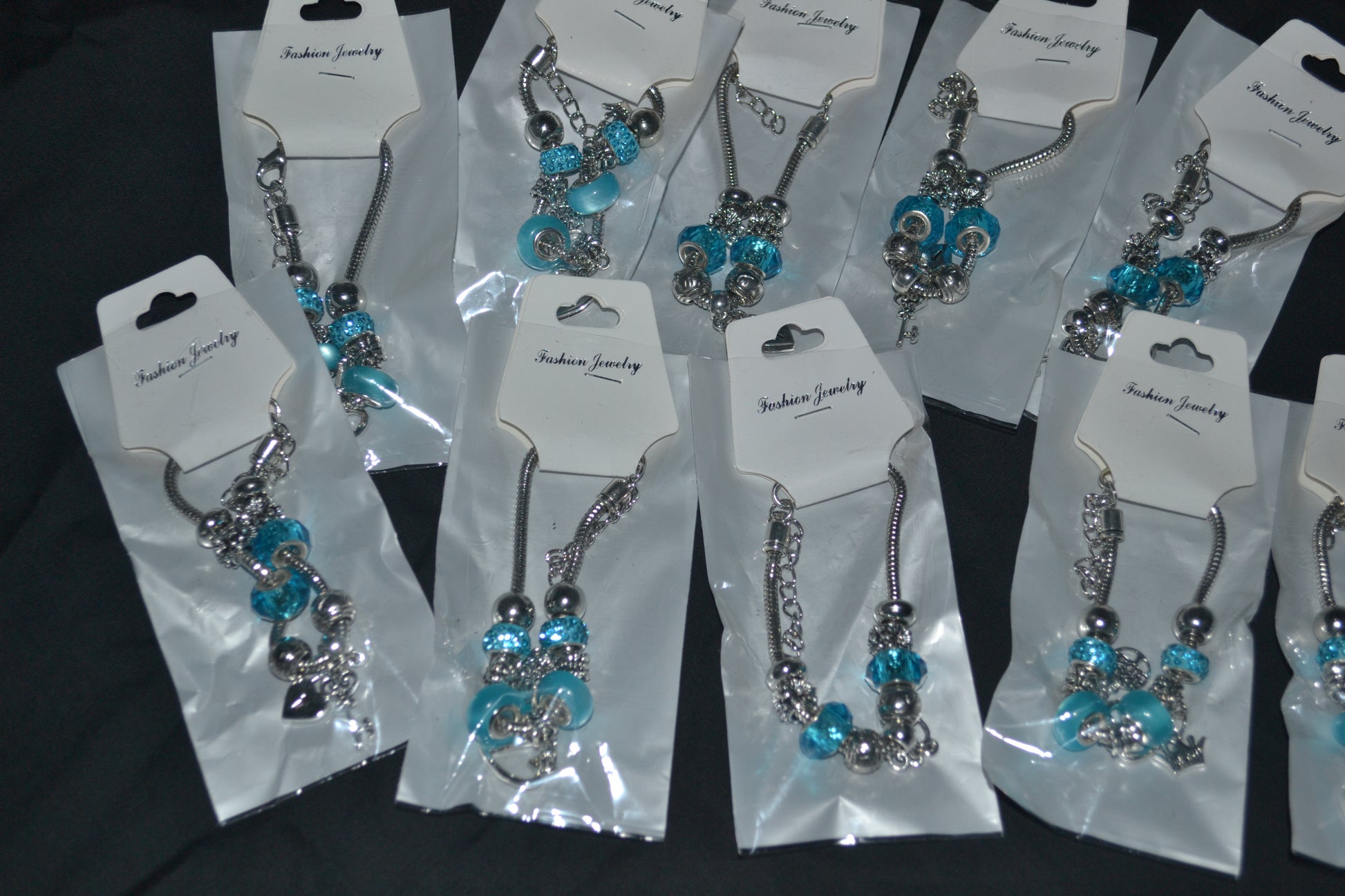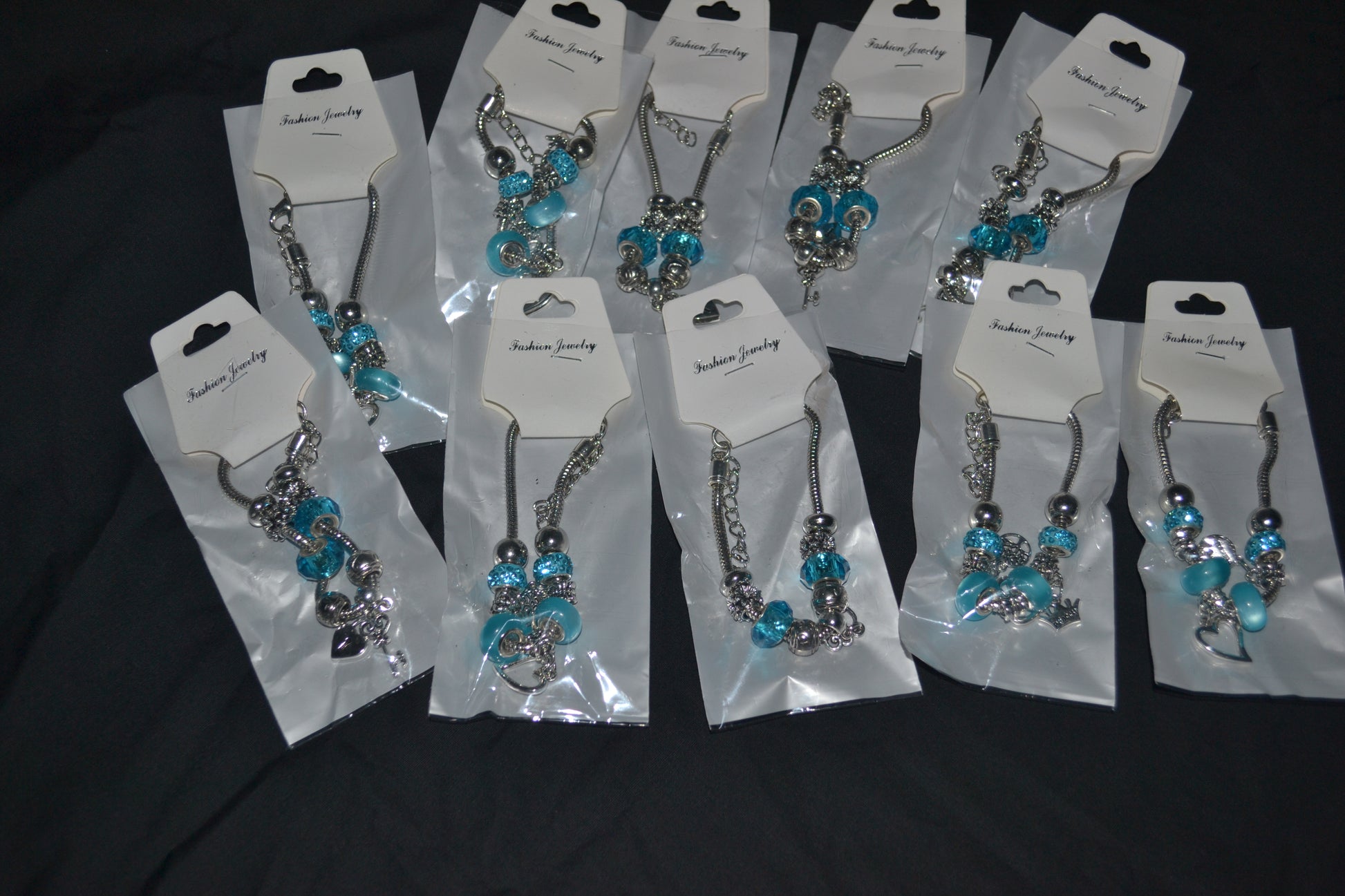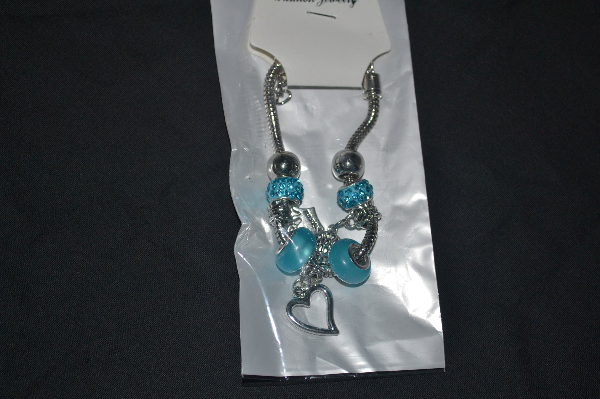 cool and calming tones come together in this silver bracelet with turquoise and blue glitter beads. Finished with silver charms and a heart dangle.