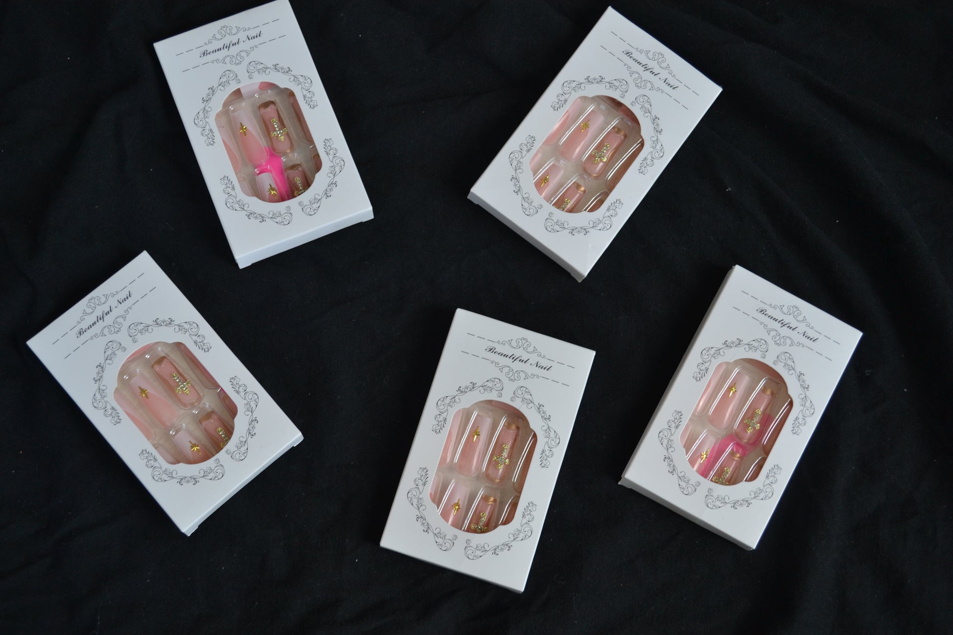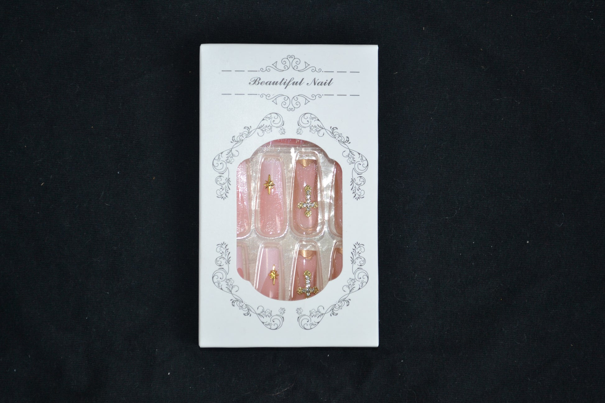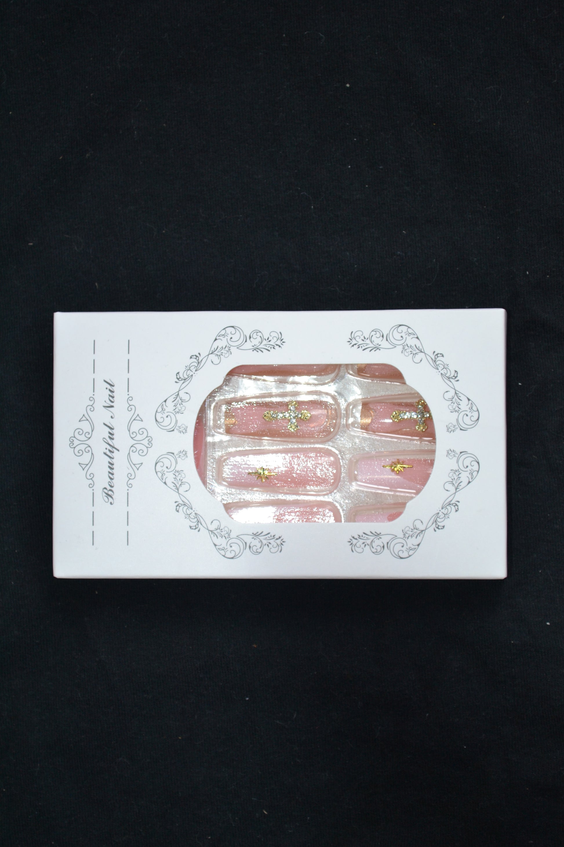 Chic and graceful, these shimmering pink nails are accented with dainty golden crosses and stars. Whether you're going for a celestial vibe or just love a little sparkle, this set brings effortless glam to your fingertips.
