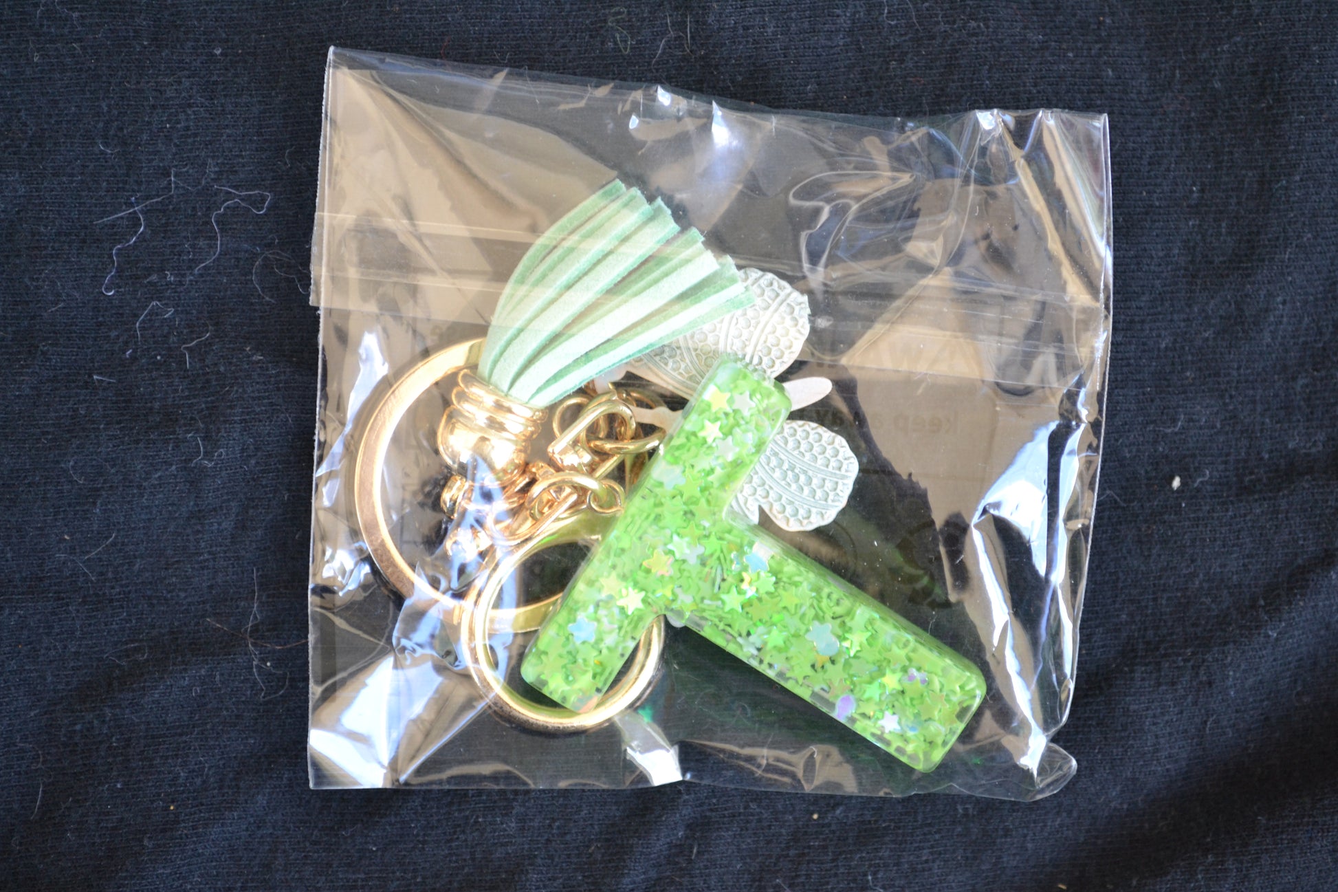 Add some sparkle to your day with this green resin ‘S’ initial keychain! It comes with a pastel tassel, glittery leaf charm, and golden ring—perfect for your keys, backpack, or purse.