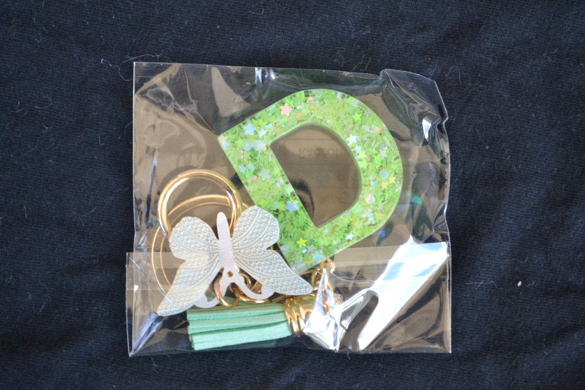 This dazzling green letter ‘D’ keychain is a sweet way to show off your initial. With sparkly confetti stars, a butterfly charm, and a chic tassel, it’s perfect for gifting or treating yourself.