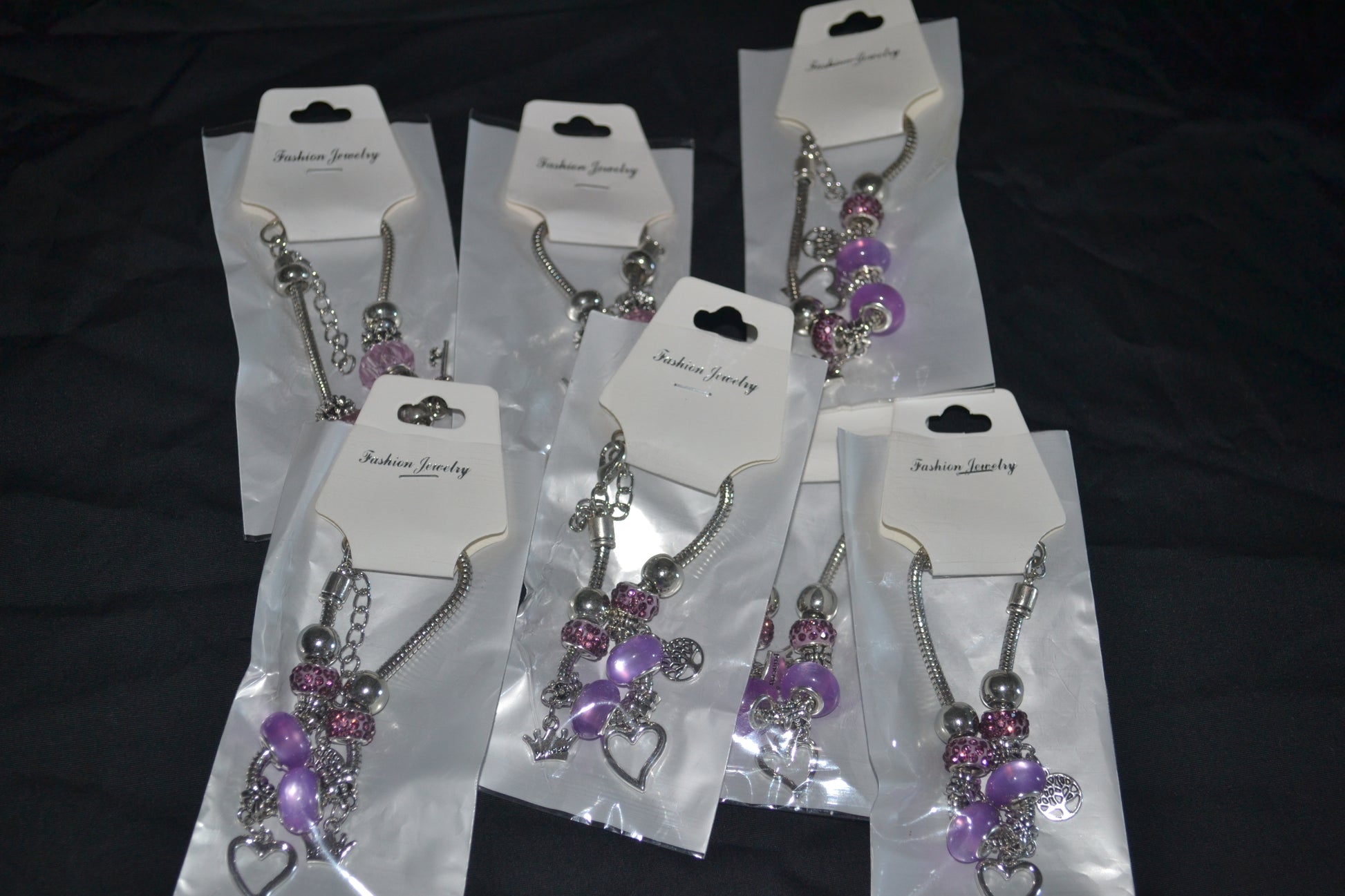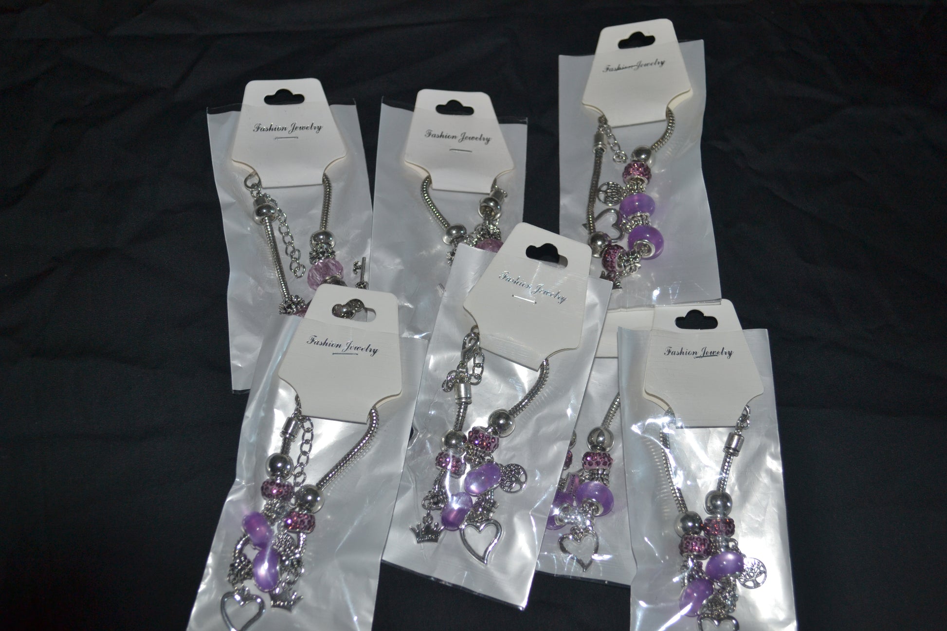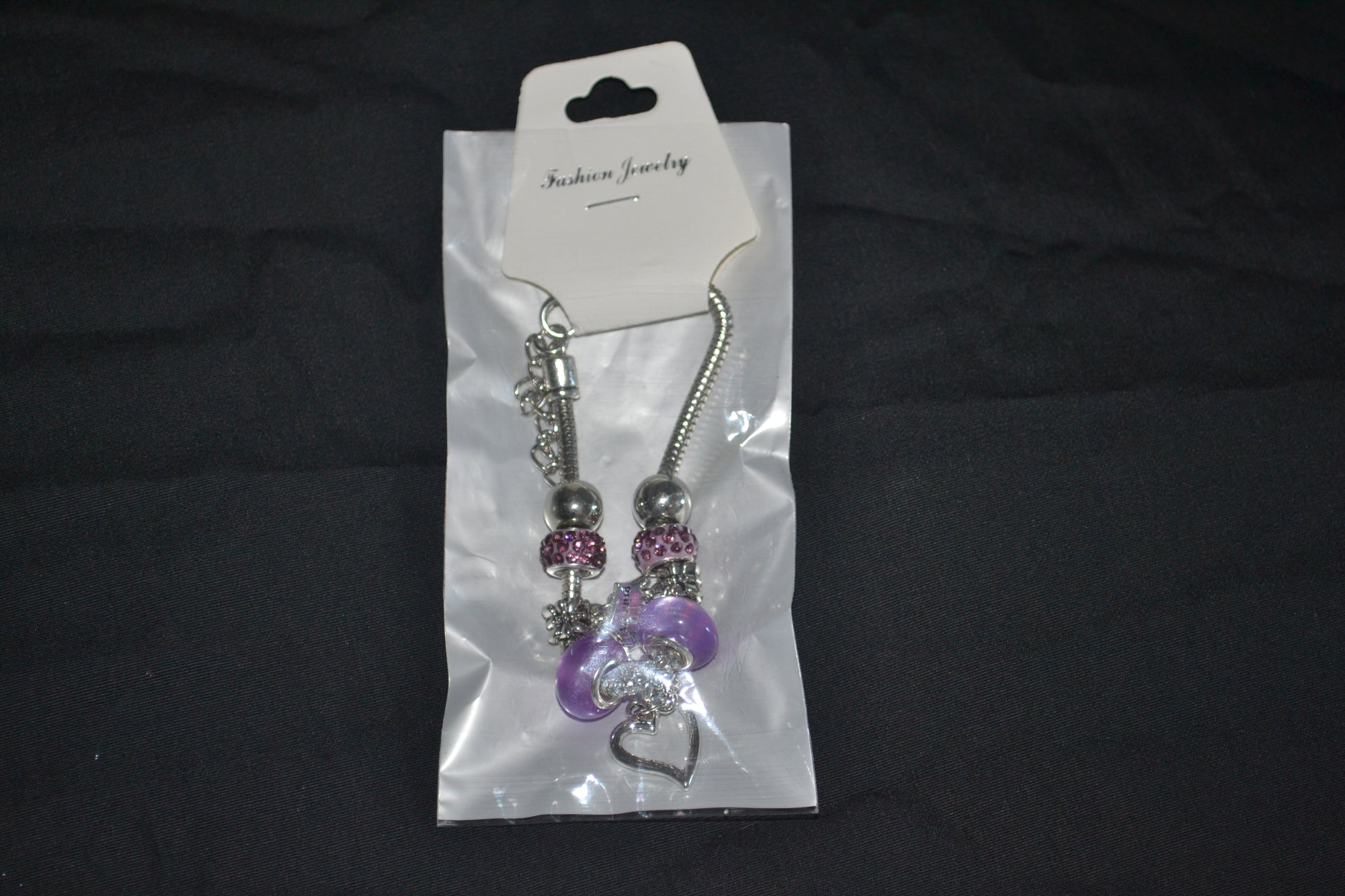 Whimsical and chic, this bracelet features lavender glass beads with rhinestone sparkle. silver heart and bow charms complete the dreamy look.