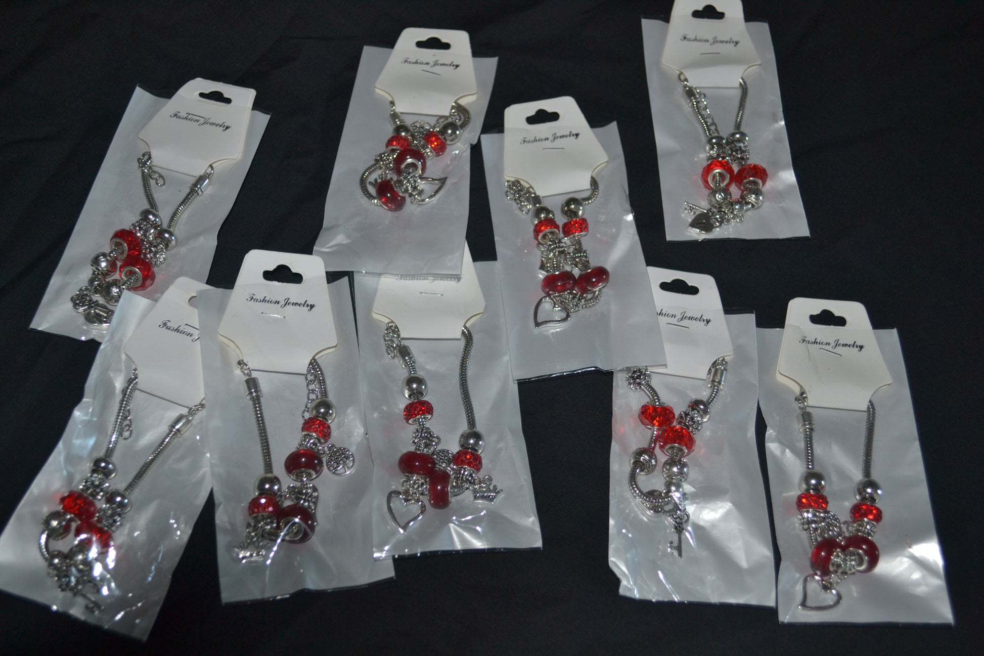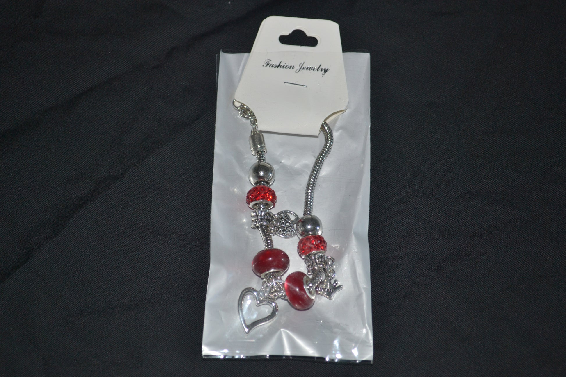 Fiery and fun, this bracelet features deep red glass beads and a mix of silver charms including hearts and crowns. Great for bold looks and gifts.