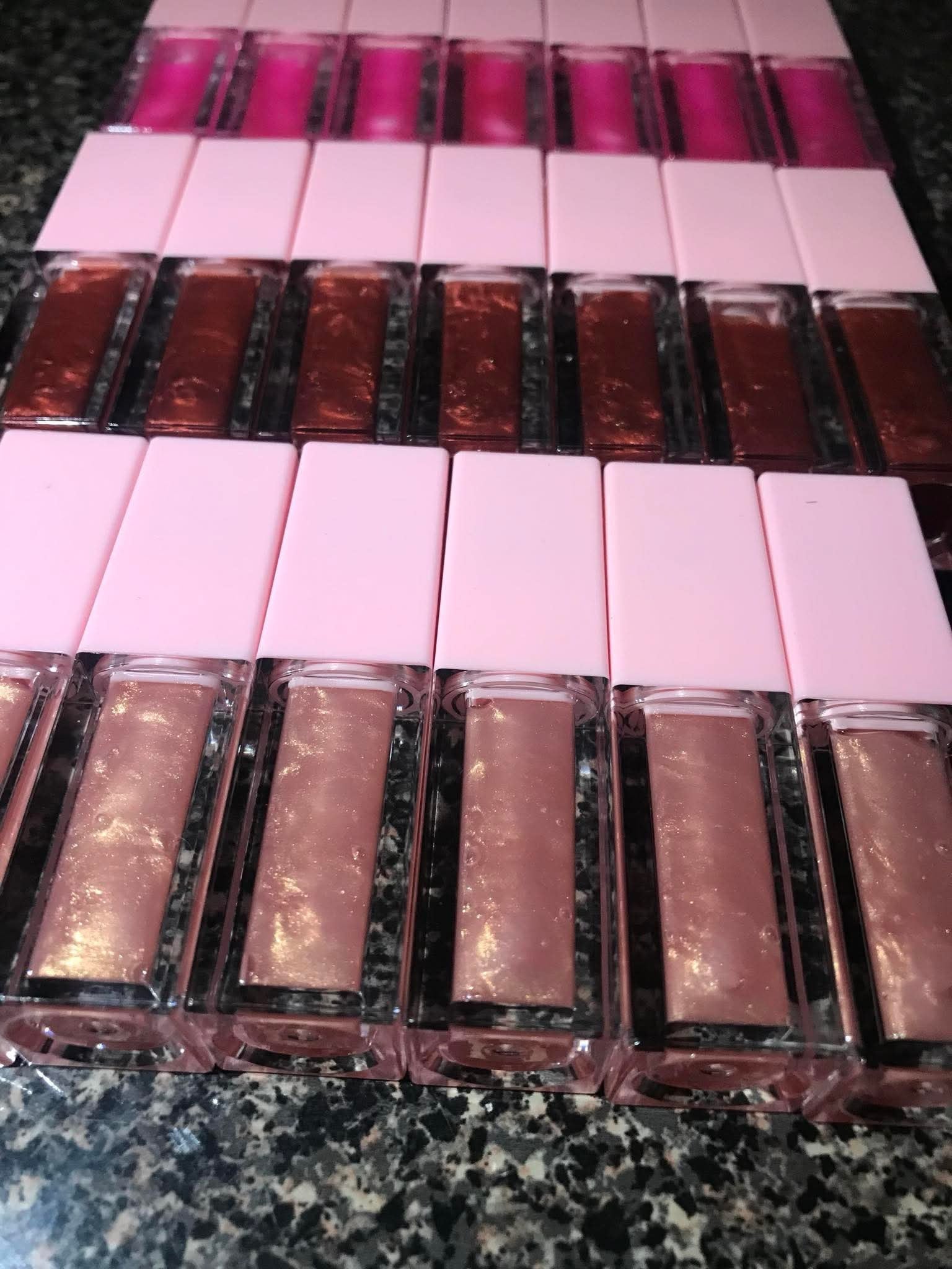 Lipgloss Base, Organic Coconut Oil, Mineral Oil, Cosmetic Grade Pigment Powder, Cosmetic Grade Mica Powder